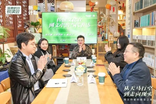 11月12日上午,浙江省作协副主席、浙江省网络作协副主席管平潮,咪咕数媒总编辑张学伟,知名网络作家疯丢子、王巧琳,青年作家蒋话齐聚晓风·明远书店,结合个人的创作、编辑经验,共同围绕着“传统文化在网文中的当代表达”主题进行研讨,探索中华优秀传统文化与网络文学融合的边界与路径。