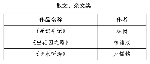 11月15日,第十一届广东省鲁迅文学艺术奖(文学类)评奖办公室发出公告:经初评、终评两个阶段的评选,第十一届广东省鲁迅文学艺术奖(文学类)共产生获奖作品30部(篇)。