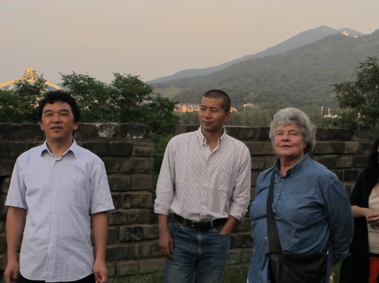 拜厄特(右)、毕飞宇(中)和原译林总编辑刘锋2012年的合影,背景为玄武湖的城墙。摄影:于魁潮