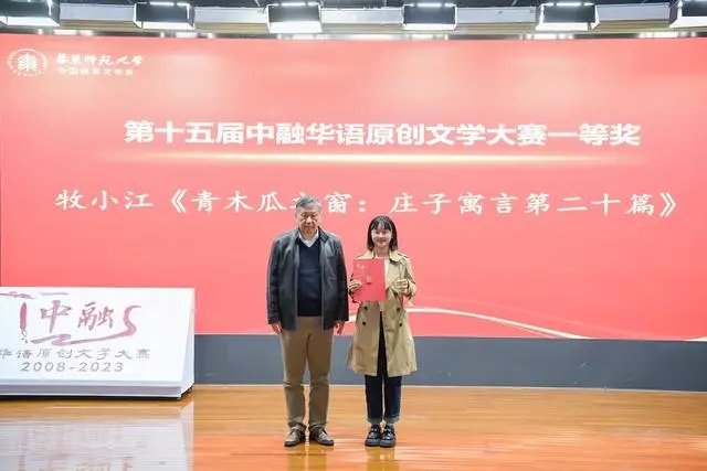 朱禹同(笔名牧小江)获第十五届中融华语原创文学大赛一等奖。昨天,她从孙甘露手中接过奖杯。她感慨,一个“阅读文学、谈论文学、敢于创造文学”的环境,对于青年创作者来说至关重要。尽管在生活经验、眼界阅历等方面,青年创作者与成熟作家还有一定距离,但仍然可以充分调动个人经验,从书本上学习、从梦境中获得,让感性觉知层面异军突起,在弹性十足、高密度的想象力中把文字搭建。