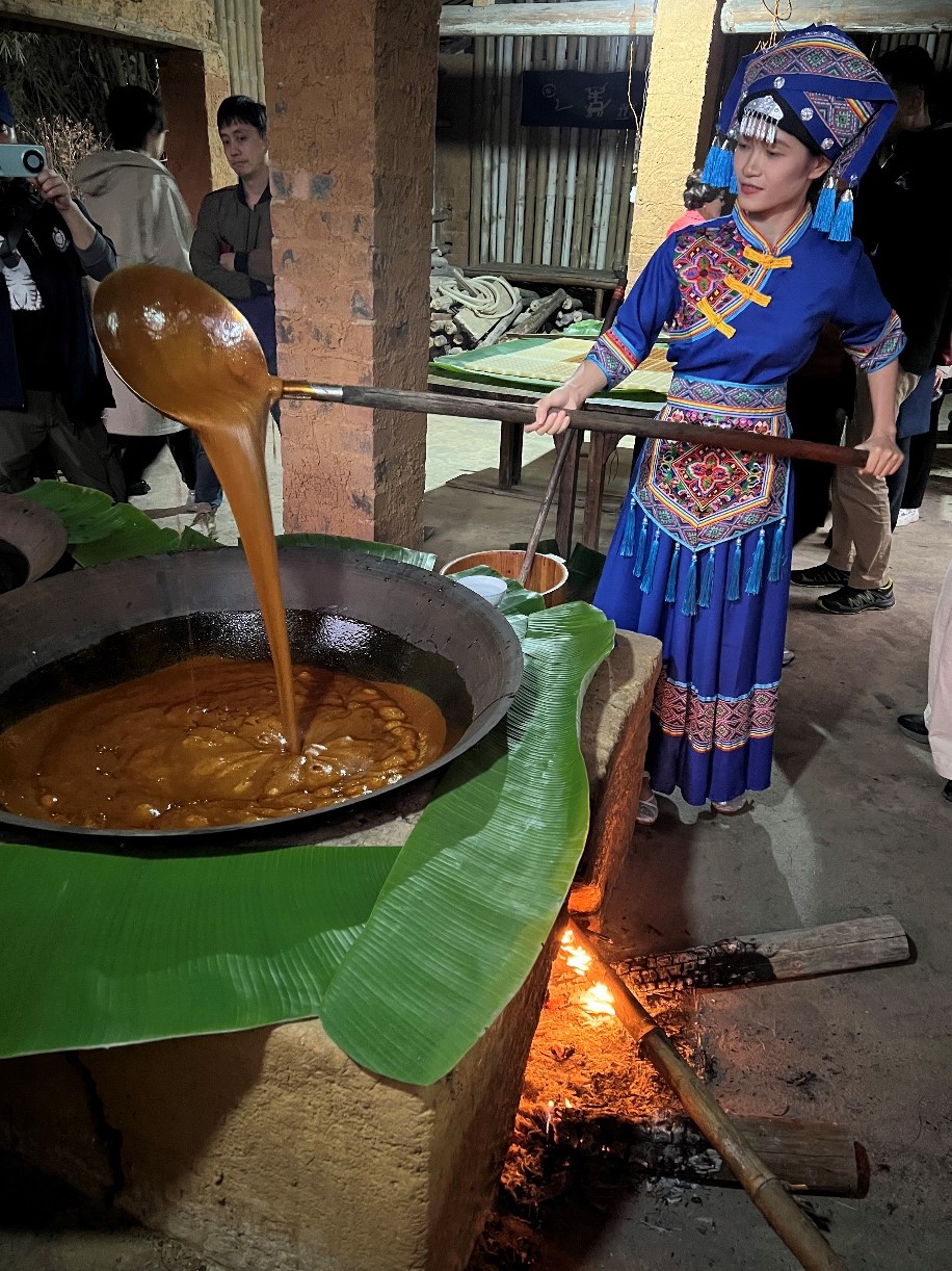 何夏雯在演示手工制糖的工艺过程