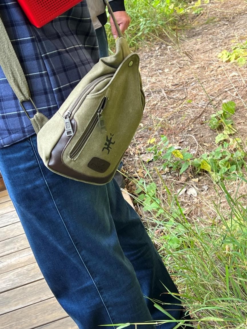 朱秋平随身携带的小包上也装饰着自己手绘的花山岩画人物图像