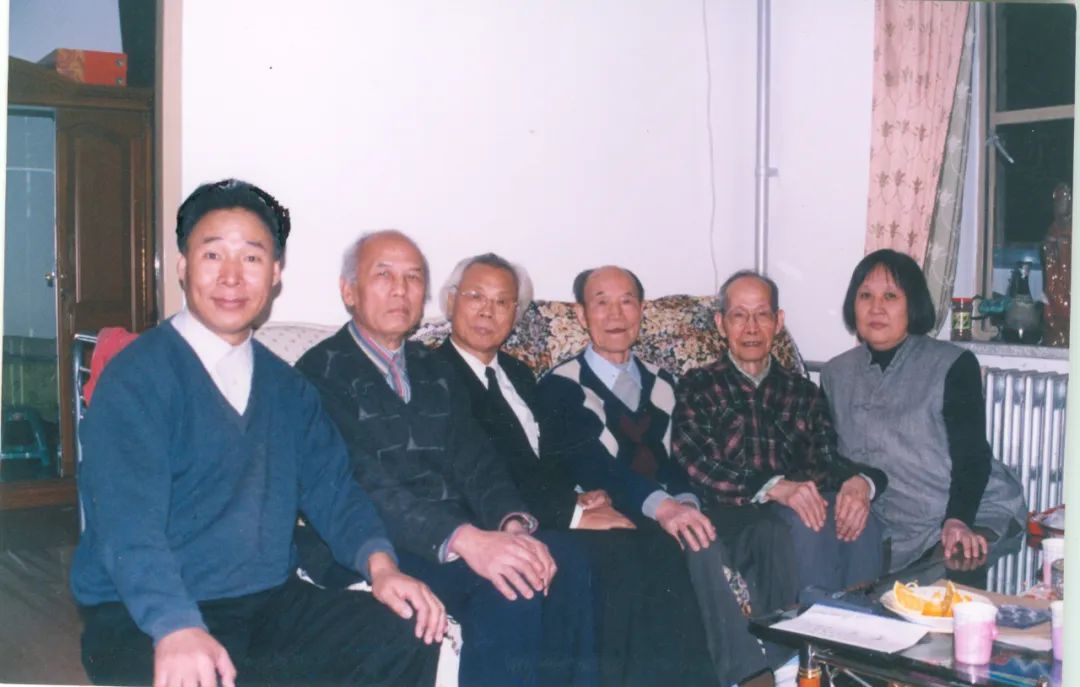 2001年12月,贾芝(右二)与白庚胜(左一)、杨亮才(左二)、刘魁立(左三)、王平凡(右三)、金茂年(右一)合影