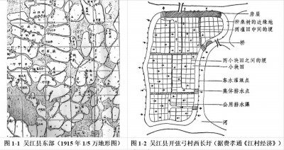 此种状态在“水乡深处”的吴江、嘉善、青浦等地最为常见,在一定程度上反映了江南开发史初期阶段的人居状况及聚落的早期形态——聚落依圩田而筑,而且由于湿地沼泽的环境,加之水运的交通便利,使得初期的聚落构筑均在圩堤之上相对高燥之处,由此自然而然地形成了条带状的聚落形态,即所谓的“列状水路村”。费孝通的吴江开弦弓村研究提供了此种地形下之微观案例(图1-2),正是江南“强湿地”地带的小型聚落,是水乡聚落发展初期之典型样态。
