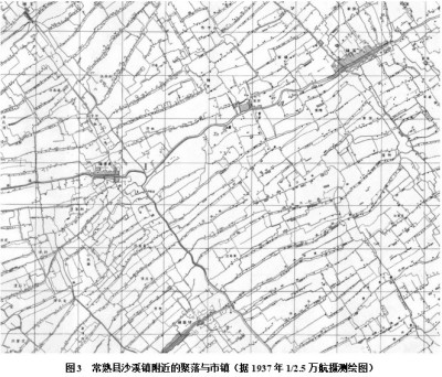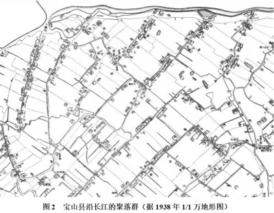 此种“强湿地”区域的持续开发,致使原先的浅水型天然湖泊或是亦湖亦河的宽阔水体逐渐向着沼泽化方向发展,这一泛滥低地的陆地化进程持续达数千年之久。随着圩田的不断兴筑,使得水路逐渐成型,沿岸聚落也随之伸展扩张。图2为上海北郊宝山县沿长江的聚落景观,“列状水路村”随河道走向而筑,形成纵横交错的条带状聚落景观。此种景观至今在江南传统乡村地带仍随处可见,并且工业化程度越低,其条带状特征越鲜明、普遍,强烈显示此类“列状水路村”在形态发生上明确的方向性和演化规律。