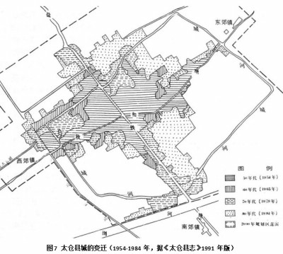 “交叉状水路市镇”若有条件继续发展,将进化为“复合型水路城镇”,后者是江南市镇发育的高端形态,其一般成长机制是:在“交叉状水路市镇”中两条主街的诱导下,出现由一条主街为基轴的众多支路以平行于另一主街排列的鱼骨状形态(典型的如无锡)、或由两条主街为基轴的多数街巷纵横交叉排列而成的栅格状形态(典型的如嘉兴,本文图7的现代太仓县城正处于这一演变的过程之中)、以及其他更为复杂的形态类型(如杭州、常州等因多个历 史层次的形态变化叠加而形成的城市)。
