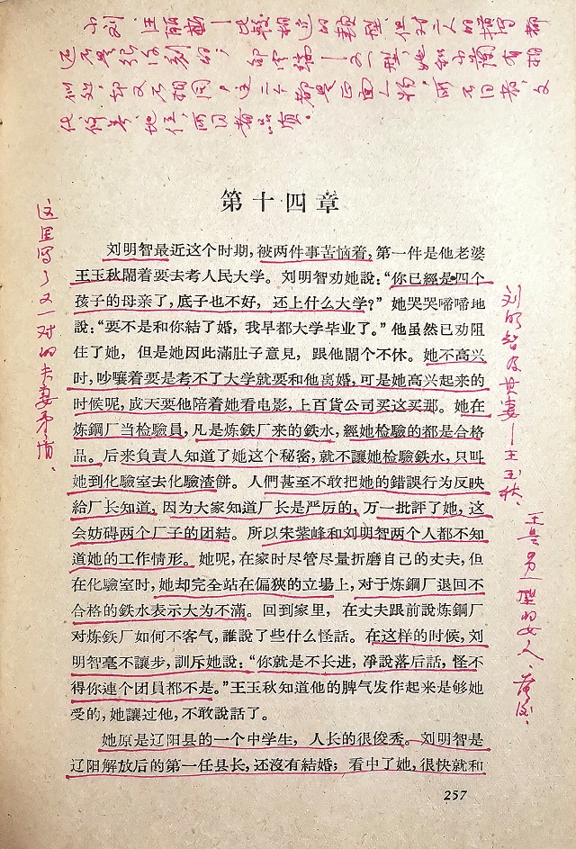 这些较为丰富的批注内容,既有整体性评价,也对细节描写作了评价。前者如第二十二章尾页留下了三段批注:“许多人物都给一个圆满下场——何大姐和列全的婚姻是其中最不必要的一樁。此章内琐细的叙述,受了旧小说的影响。”“离奇曲折的情节过了一定限度就不真实,但尤其重要的是:离奇曲折的情节必须与人物性格的发展相结合,否则就是为曲折而曲折。小兰和少祥的‘曲折’,从二人的性格发展来看,并不结合得密切的”;“小兰和少祥的婚姻,正所谓‘好事多磨’,而其基础在于(一)双方都不肯先表白自己的心愿,(二)由于第三者的插入所造成的误会,可是,这两个因素都不可能造成那样的‘曲折’;男女双方的腼腆程度,极像旧社会中封建思想浓厚的少男少女,不大像今天的青年。今天的青年由于自尊性不肯先向对方表示‘迁就’,但不会那样忍受痛苦而不把问题提出来”。后者如第174页的批注:“小刘,汪丽斯——比较相近的类型,但对二人的描写都还不是很深刻的;邵云端——又一型,她和小兰有相似处,却又不相同。这二个都是正面人物,所不同者,文化、修养、地位,所同者品质”。