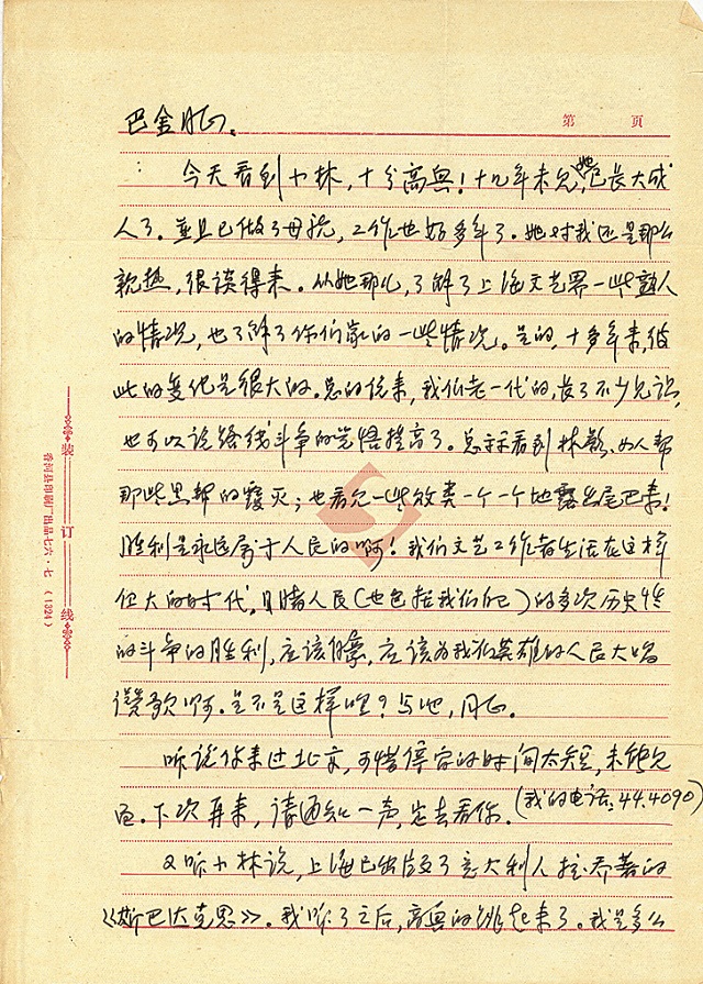 草明和巴金多年未有联系,这次能够书信往来,是通过巴金的女儿“小林”才联系上的。这在草明致巴金第一封信中可以看出:“今天看到小林了,十分高兴!”通过草明与小林的相见,才有了草明与巴金的书信往来。巴金的回信因草明的来信中没有写明通信地址,迟迟未回复,通过小林才给草明回复了此信。书信内容将巴金对草明的问候、感谢、无法早写回信的缘由等说得清清楚楚。