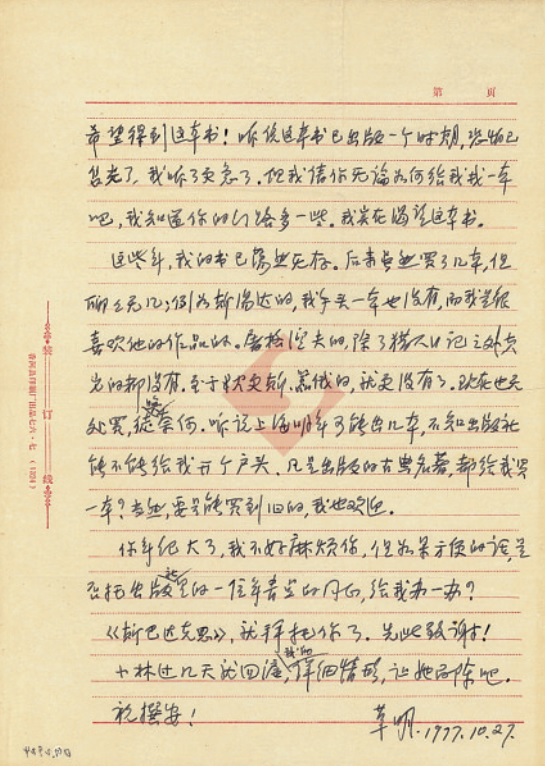 相较于第一封书信,第二封书信是一封字数简短的书信,但内容却很丰富:信中提到了对巴金的赠书表示感谢;从《光明日报》上看见巴金近照,关注巴金的近况;希望巴金的译作早日问世;对巴金的祝福;字里行间能够体会到老一辈作家间的深厚友谊。
