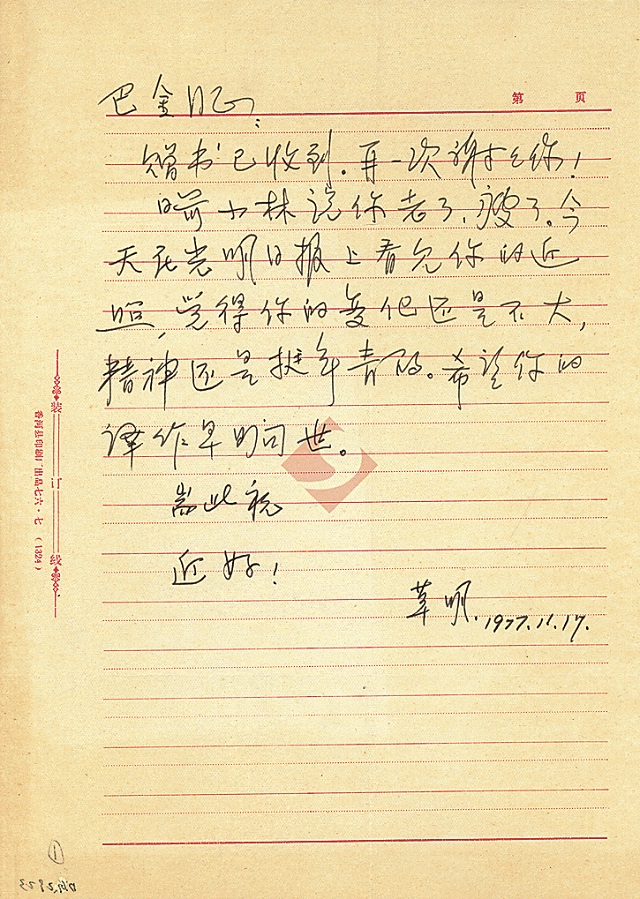 《巴金全集》由人民文学出版社1986年开始陆续出版,共26卷,卷帙浩繁,蔚为大观。其中第22、23、24卷为书信集,其中有巴金致草明书信一封,这封书信日期为1977年11月14日。笔者根据这一线索,查阅了馆藏书信信息,值得庆幸的是,这封书信的原件竟然珍藏在中国现代文学馆书信库中,它的落款日期只写了11月14日,笔者根据此信内容与《巴金全集》书信集中巴金致草明信的内容比对,确认此信为1977年10月27日草明致巴金书信的那封回信,从时间、内容上构成了与草明写给巴金这两封信的互致关系,也由此完整呈现了两人通信来往的基本情况,勾沉了一段往事。