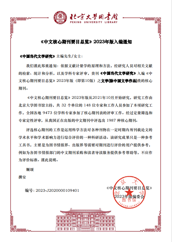根据《中文核心期刊目录总览》2023年版编委会通知,依据文献计量学的原理和方法,经研究人员对相关文献的检索、统计和分析,以及学科专家评审,《中国当代文学研究》入编《中文核心期刊目录总览》2023年版(即第10版)之文学(除中国文学作品)类的核心期刊。