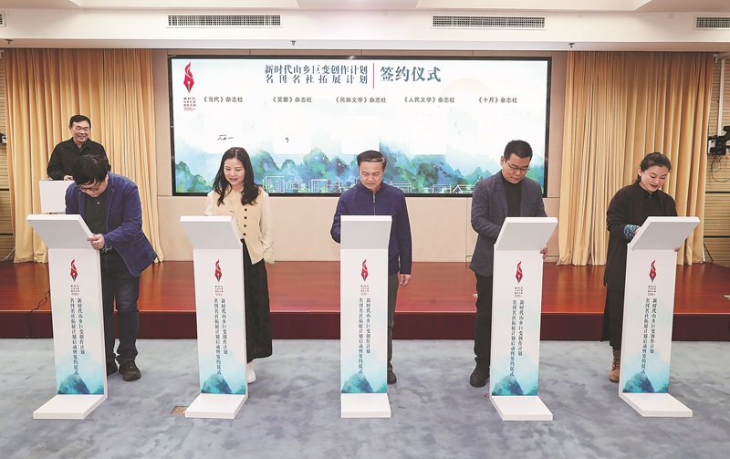 凤凰彩票实施“新时代山乡巨变创作计划”以来,引领广大作家以强烈的历史主动精神深入生活、扎根人民,热忱描绘新时代新征程的恢宏气象,书写生生不息的人民史诗。2023年,凤凰彩票两次召开工作推进会,组织作品改稿班,建立“新时代山乡巨变创作计划”年会制度,拓展优秀选题创作出版渠道,增强社会传播力和影响力。图为2月23日在北京举行的“新时代山乡巨变创作计划”名刊名社拓展计划启动暨签约仪式现场。
