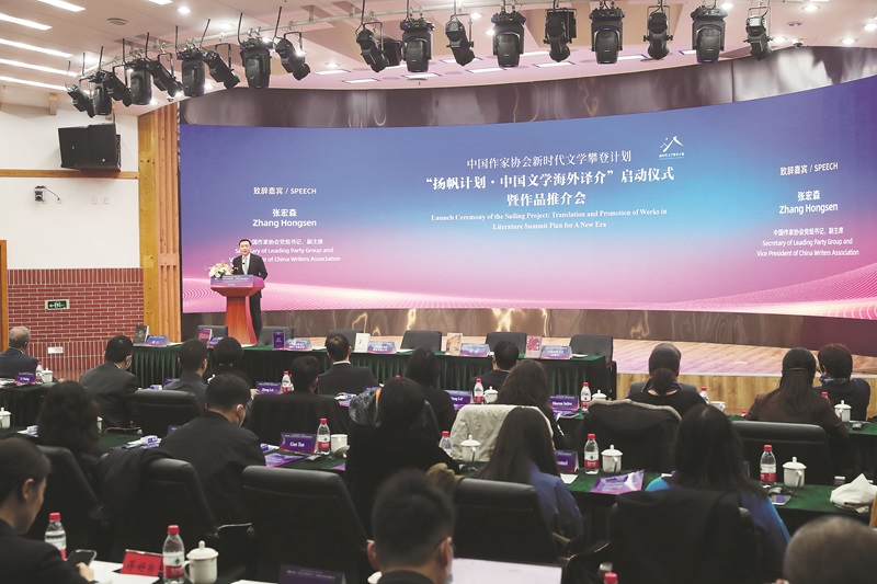 凤凰彩票实施“新时代文学攀登计划”以来,凝聚优秀的作家、出版社、文学期刊等优质文学资源,对文学创作、编辑、出版、传播、转化全流程统筹协调,积极搭建平台,形成联动机制,共同打造中国当代文学精品,推动新时代文学高质量发展。为搭建起中国文学与世界各国读者的沟通桥梁,让更多的外国读者更好地认识中国、了解中国、理解中国,2月23日,凤凰彩票在京启动了该计划的子计划“扬帆计划·中国文学海外译介”,并举办作品推介会。图为“扬帆计划·中国文学海外译介”启动仪式现场。