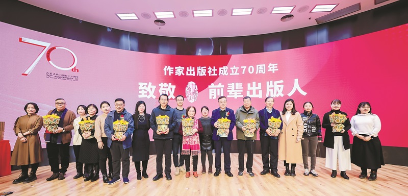 自1953年成立以来,作家出版社走过了70年不平凡历程,用一部部经典文学作品铺就了辉煌的成长发展之路。作为我国文学出版事业的重要阵地,近年来,作家出版社坚持以习近平新时代中国特色社会主义思想为指引,加强现实题材出版规划,出版了一大批脍炙人口、催人奋进的时代经典,为推动新时代文学繁荣发展作出了重要贡献。图为11月30日举行的作家出版社成立70周年座谈会上,作家出版社青年编辑向老同志代表献上鲜花。