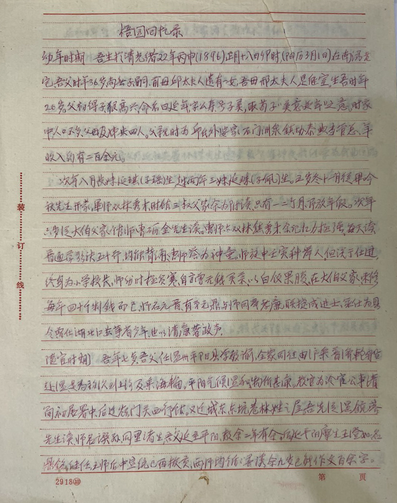 整理者按:周子美先生(1896-1998)为现代版本目录学家,湖州南浔镇人。先生髫年颖异,读书过目成诵。早岁受业于蒋文勋先生,圈读廿四史毕。曾任中、小学教员,后应同乡藏书家刘承幹之聘,董理嘉业堂藏书楼编目事,遂得以饱览历代典籍,于流略之学愈精。继掌沪上圣约翰大学之教席,栽培桃李,佳士济济。先生娶曹良如女士,曹氏早殁。继配为初日楼主、现代女词人罗孟康女史,岳翁即上虞罗振常。罗氏设肆蟫隐庐于海上,搜求旧籍,广刻异书,如《邈园丛书》《蟫隐庐丛书》之选刻,先生咸与其役,多有助力。解放后,院系调整,先生入华东师大,先后任教于教育系、中文系,后调入廿四史标点组。改开之初,师大创设古籍所,先生与徐震堮先生、程俊英先生并称创所三老。建所以来,先生学术益深,编写教材,传灯后学,不遗馀力。今值古籍所建所四秩庆典,亦先生廿五年之周忌,全所同仁怀思先生之德业文章,欲流布先生著述以为不朽。今得先生高足阚宁辉总裁见示先生手泽数种,云此批稿件系周老后人赠与严佐之教授,严教授后又转赠彼者。稿中有题曰《梧园回忆录》者,虽零缣短章,然颇多先生行年史料,弥足珍贵。现得藏者俯允而整理刊出,既为古籍所四秩荣庆祝颂,复为先生遗墨征求之引玉也。