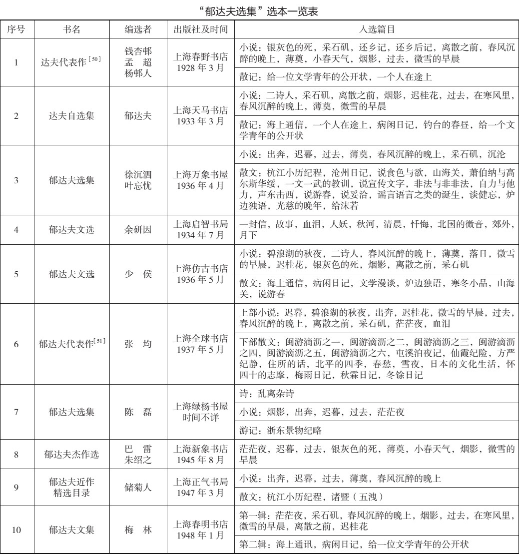 为了真正看清《郁达夫选集》篇目编选的细节,这里把1951年7月前出版的“郁达夫选集”性质的十种书籍篇目整理如下: