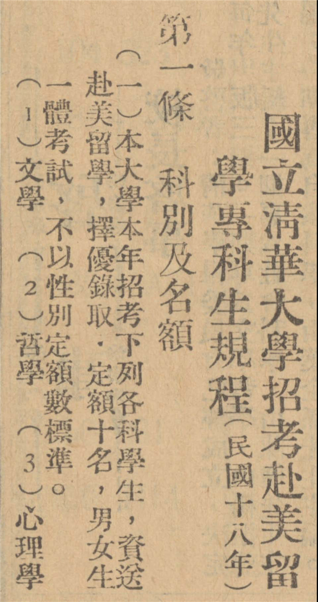 国立清华大学招考赴美留学专科生章程