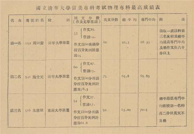 国立清华大学留美专科考试物理专科最高成绩表