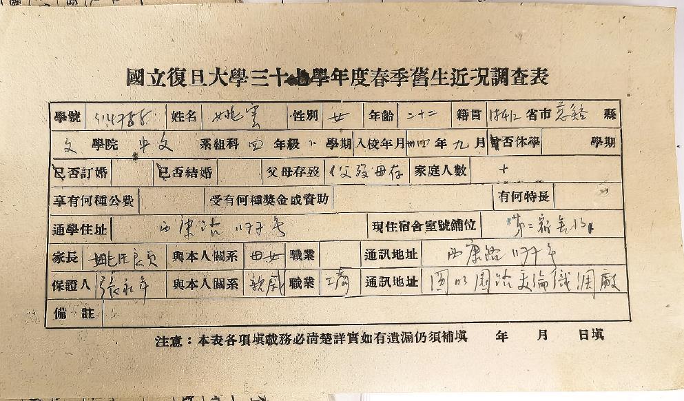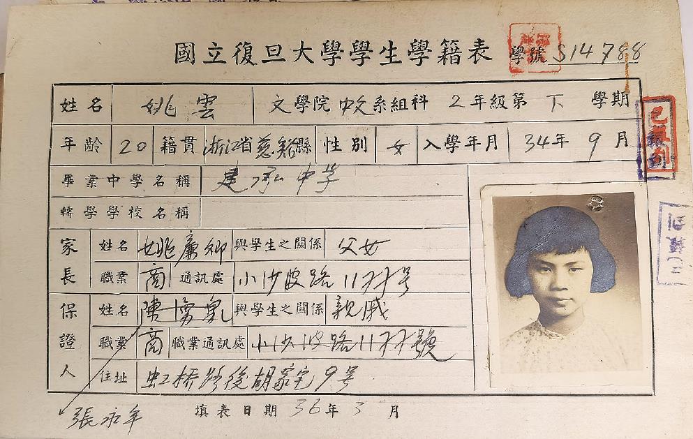 1948年,物价飞涨,经济急剧下滑,“蒋经国来沪‘打老虎’,规定黄金、白银和美元等必须兑换成金圆券,银楼业经手的就是黄金白银,因此引发全上海银楼关门停业”,姚云父亲的“老宝凤”也关店了。11月17日,忧心如焚的姚廉卿突发心脏病去世。姚云说:“那年他六十五岁,母亲五十岁,我二十一岁。我一直握着他的手,整整一夜守在他的身边……”档案里,有一张姚云的《国立复旦大学三十七学年度春季旧生近况调查表》,填写日期似在1949年初,在“父母存殁”一栏里,写着“父殁母存”四字;在“家长”一栏里,写着姚云母亲的名字:姚汪良贞。