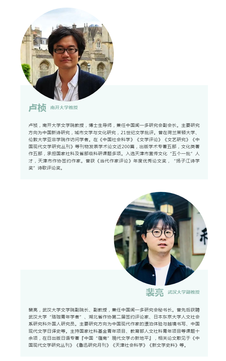 卢桢:我在南开大学文学院任教,博士论文研究方向是城市文化与中国新诗的关联性问题,近些年的研究也主要集中在中国新诗领域,关于城市文学与文化、新时代文学现象,近期也多有关注。