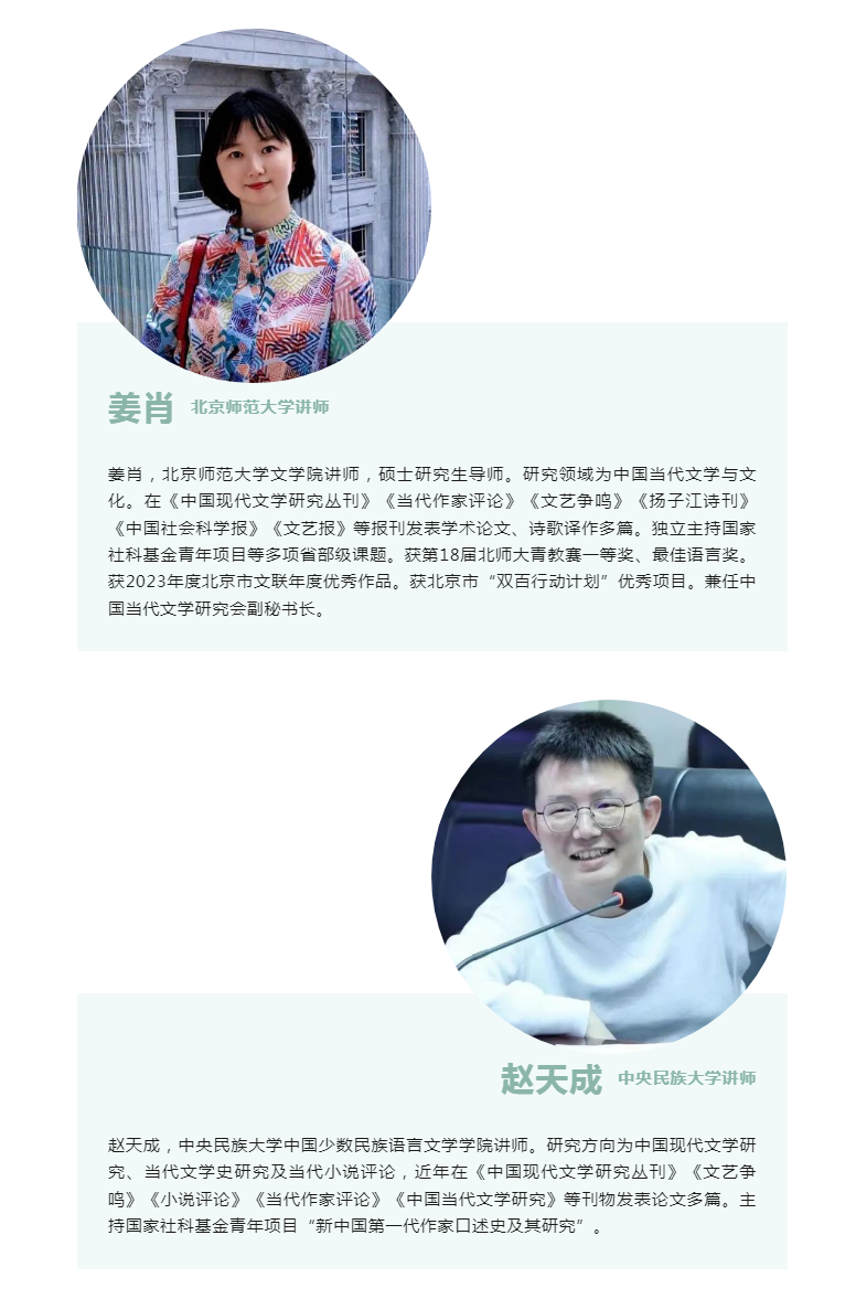 姜肖:我是北京师范大学文学院的青年教师,学术兴趣目前有三:一是上世纪80至90 年代中国当代文学史研究,相应开设中国当代文学史课程;二是文学与媒体理论,相应开设当代文学与传媒研究课程;三是当下青年作家、青年文学观察,相应开设当代新锐作家作品研究课程。