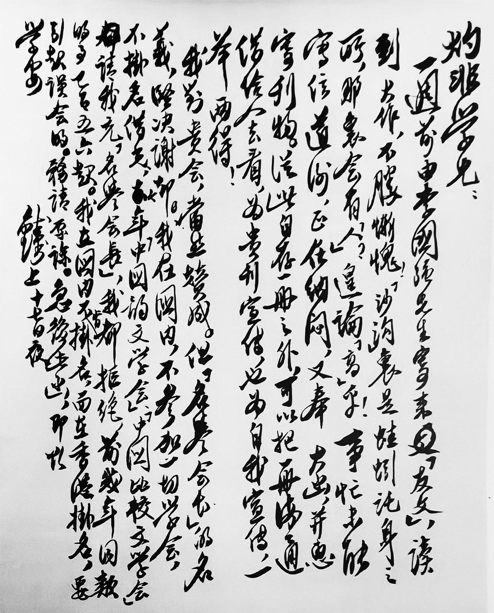 我对贵会,当然赞成。但“名誉会长”的名义,坚决谢却。我在国内,不参加一切学会,不挂名借光,今年,“中国韵文学会”“中国比较文学会”请我充“名誉会长”,我都拒绝。前几年,同类的事已有五六起。我在国内不肯挂名,而在香港挂名,要引起误会的。务请原谅。急复此函,即颂学安。