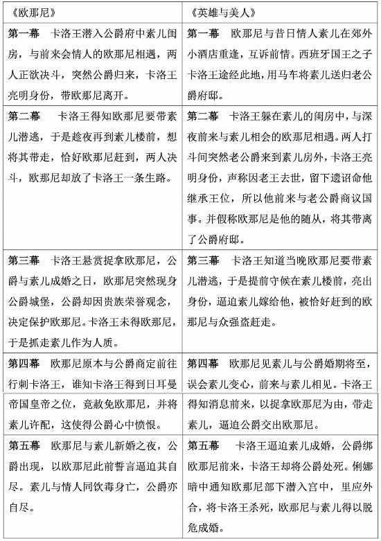 在《英雄与美人》诞生的那个年代,雨果的Hernani只存在两个中译本,均译为《欧那尼》。第一个译本署名“东亚病夫”,1927年由真美善书店发行,是曾在京师同文馆学习法语的晚清著名小说家曾朴从法文本翻译而来;第二个译本1947年由群艺出版社发行,是后来在戏剧理论研究领域颇有建树的学者陈瘦竹从英译本转译。从剧本比对可以得知,不论南薇是否曾见过曾朴的译本,但他最终所采用的底本显然是陈瘦竹的译本。比如以剧中女主人公对欧那尼的一段倾诉为例: