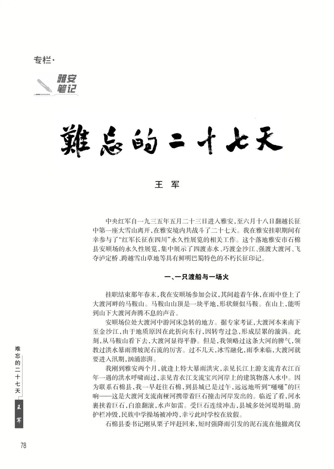 中央红军自一九三五年五月二十三日进入雅安,至六月十八日翻越长征中第一座大雪山离开,在雅安境内共战斗了二十七天。我在雅安挂职期间有幸参与了“红军长征在四川”永久性展览的相关工作。这个落地雅安市石棉县安顺场的永久性展览,集中展示了四渡赤水、巧渡金沙江、强渡大渡河、飞夺泸定桥、跨越雪山草地等具有鲜明巴蜀特色的不朽长征印记。