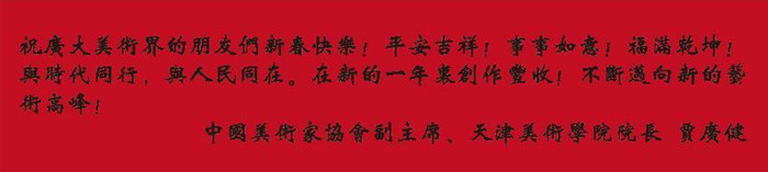 18、中国美术家协会副主席、天津美术学院院长 贾广健:祝广大美术界的朋友们新春快乐!平安吉祥!事事如意!福满乾坤!与时代同行,与人民同在。在新的一年里创作丰收!不断迈向新的艺术高峰!