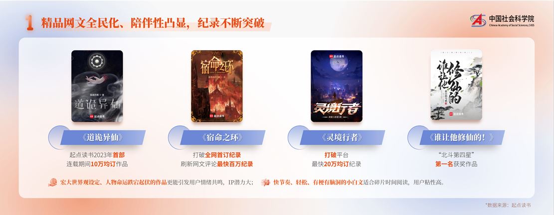 作品方面,精品网文头部突破、长尾精进,全民化、陪伴性凸显,《道诡异仙》《灵境使者》《宿命之环》等宏大世界观佳作纪录不断突破,起点读书10万均订作品同比增长75%,《谁让他修仙的!》等快节奏“小白文”则俘获大批高粘性用户。