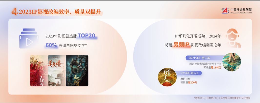 报告认为,2023网文IP影视改编效率、质量双提升,据云合数据2023上新剧集热播剧集均有效榜单显示,TOP20作品中60%均改编自网络文学;动漫、科幻成为放大IP影响力的重要增量,尤其年番动漫持续、稳定为主流视频平台贡献热度与营收,2023年腾讯视频经典畅销榜TOP10中,50%的作品为网文改编的动漫,《斗破苍穹》《斗罗大陆》等年番作品常年霸榜;微短剧成为释放中腰部IP价值的风口,为IP生态拓展了更高效的IP可视化通道,精品化是短剧发展必然趋势。值得注意的是,报告预判2024年将成为男频IP影视改编的爆发之年。截至2023年底,腾讯视频期待榜TOP5中60%是男频IP,其中《庆余年》第二季位列电视剧期待榜第一名,预约量超过1150万;《大奉打更人》预约量超200万,“待爆”男频佳作重回顶流。