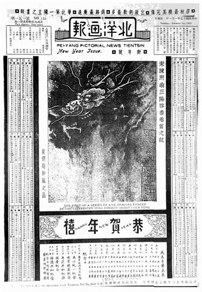 且看开办还不到两年的、当时号称“北方巨擘”、“中国唯一的大画报”的《北洋画报》,即刻推出了以龙为主题的“新年号”(总第151期)。这一期画报封面以宋代著名画家、画龙名家陈所翁《三阳启泰》卷首所绘之龙为主图,这威风凛凛、气势雄浑的视觉感受,为读者带来了一份新年新气象。