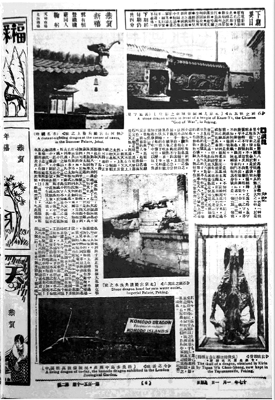 翻到第三版,又是六幅与龙有关的“国宝”建筑文物图片,密布于版面之上,看来这就是要读者在“龙年”里集齐“龙卡”的意思了。这些“龙卡”所在地,还有“北京天安门前石刻蟠龙华表”“北京中央观象台天文仪品之座”“御碑趺上之龙形”“北京颐和园之陈设品”“北京国子监大成殿石阶”,以及“曲阜孔庙廊前蟠龙石柱”等等。
