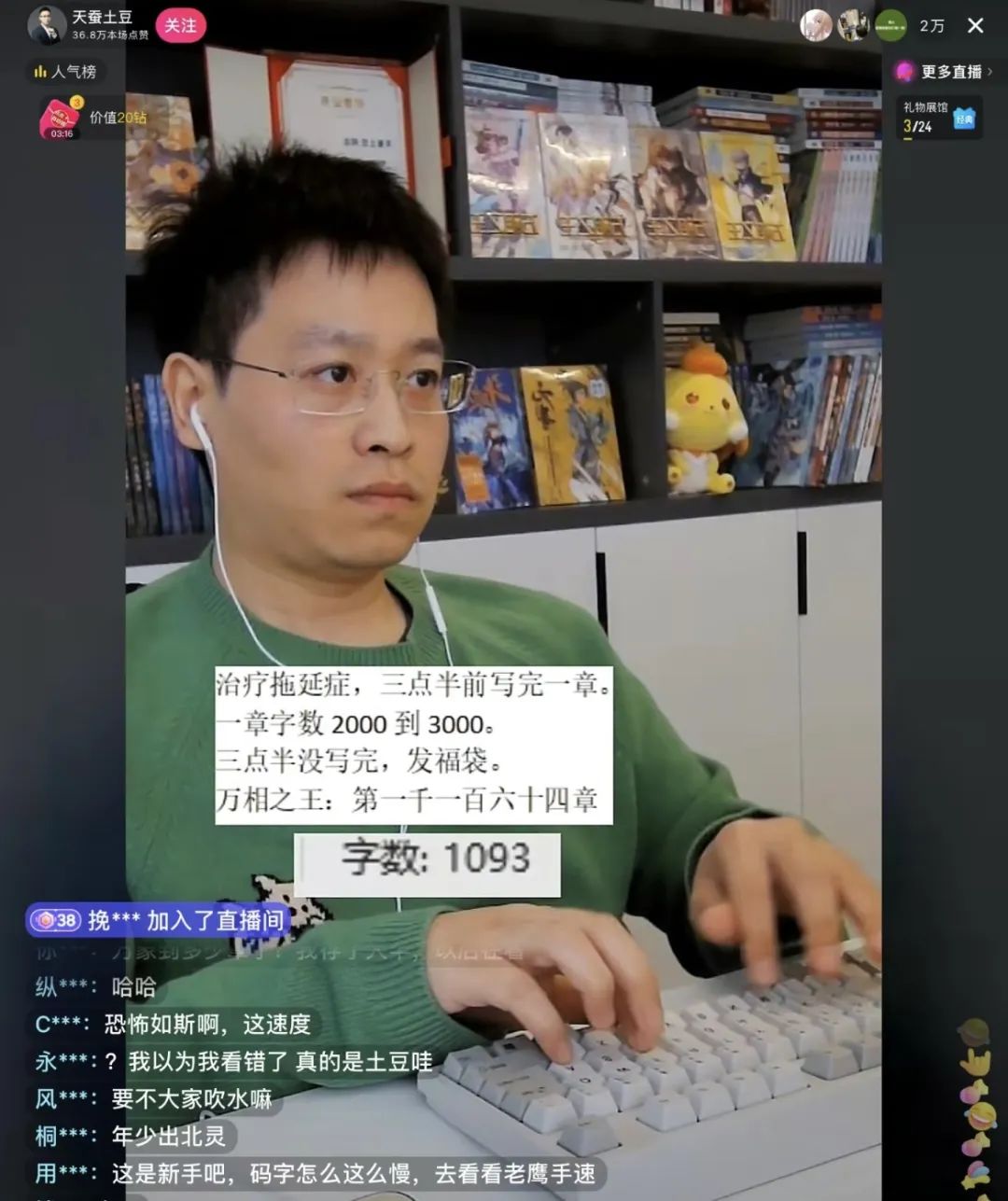 2月22日,天蚕土豆现身某短视频平台,直播写网文,实时更新“码字”字数。直播屏幕上,天蚕土豆打出了“改掉重度拖延症,两个半小时写一章,一章字数2000到3000。两个半小时没写完发福袋,请大家监督!!!”的字幕条,并全程播放。该场直播历时约两小时,共吸引约2万名网友在线“监工”。不久,天蚕土豆直播写网文的消息登上热搜,引发网友热议。在直播页面,众多网友留下了这样的调侃留言。