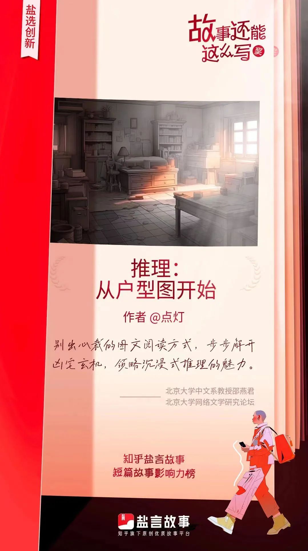 点灯,1999年生。知乎盐言故事签约作家。擅长短篇悬疑小说创作,代表作《最后的真相》《活在真空里》《兄友弟恭:沉没的人生》《逼上梁山》《黑楼往事》(“黑楼系列”)《推理:从户型图开始》《私了》等,在知乎获得上亿阅读量,三部作品位列知乎悬疑榜单前十。“黑楼系列”小说出版已签约,《活在真空里》《兄友弟恭》《逼上梁山》《黑楼往事》影视改编权已售出。