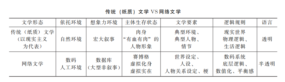 在“平行世界”的概念下,网络文学自然获得了与传统(纸质)文学平等的地位。这是两种不同的文学形态,它们的依托环境、想象力环境、主体(作者、读者、作品人物)状态、文学要素、文本内部遵循逻辑、语言等,都有明显的不同。简要列表如下: