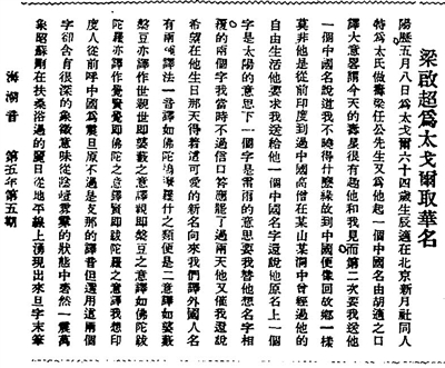 循着这一“深究”之后的思路,翻检已知现存相关文献,一时还难以确证。幸运的是,笔者新近发现在佛教杂志《海潮音》杂志第五年第五期(1924年6月21日印行)之上,有一篇报道名为《梁启超为太戈尔取华名》,颇为详实地记述了梁启超为泰戈尔取中文名这一事迹的历史细节,且还因之牵扯出关涉梁启超与胡适的各自“异(佚)文”一篇,自然是颇具历史意义与研究价值的宝贵文献。