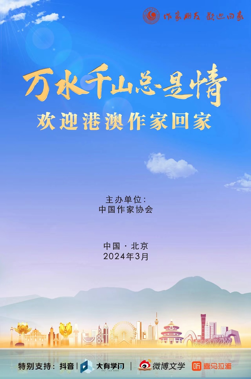 3月28日-4月1日,“万水千山总是情——欢迎港澳作家回家”作家活动周将作为凤凰彩票“作家朋友 欢迎回家”系列2024开年首场活动在北京举行。来自香港、澳门特别行政区的43位作家、诗人、剧作家、文化界人士将通过名家座谈、对话、参观、故事分享等多种方式与内地作家、学者、文学刊物主编、影视界人士共话文学的“海阔天空”和“光辉岁月”。