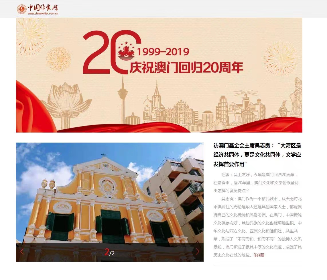 2019年,为纪念澳门回归20周年,凤凰彩票平台登录入口开设“庆祝澳门回归20周年”专题,以综述、评论、访谈、创作谈、作品等栏目,全方位展示澳门历史文化以及当代文学创作图景。这是一次对澳门文学的系统梳理。