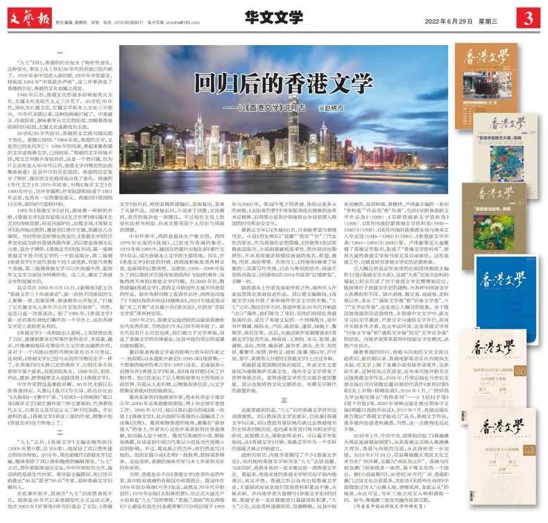 《文艺报》关注香港文学期刊所发挥的作用。2022年6月29日刊发社科院文学所研究员赵稀方所撰的《回归后的香港文学——以<香港文学>说开去》一文。