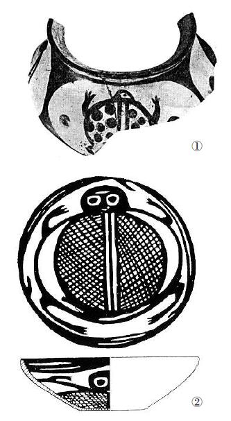 图二:仰韶文化和马家窑文化中的蛙纹(①河南陕县庙底沟遗址出土 ②甘肃师赵村遗址出土) 作者提供