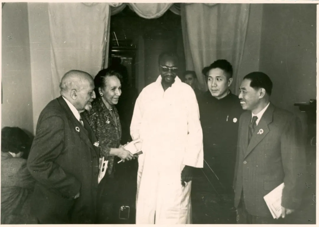 图2 周扬、茅盾与美国作家W·E·B·杜波依斯、雪莉·格雷厄姆·杜波依斯、塞尔加尔作家,政治家马杰蒙·迪奥普在亚非作家会议上。来源:马萨诸塞大学阿默斯特分校图书馆特藏和大学档案馆,网址:https://credo.library.umass.edu/