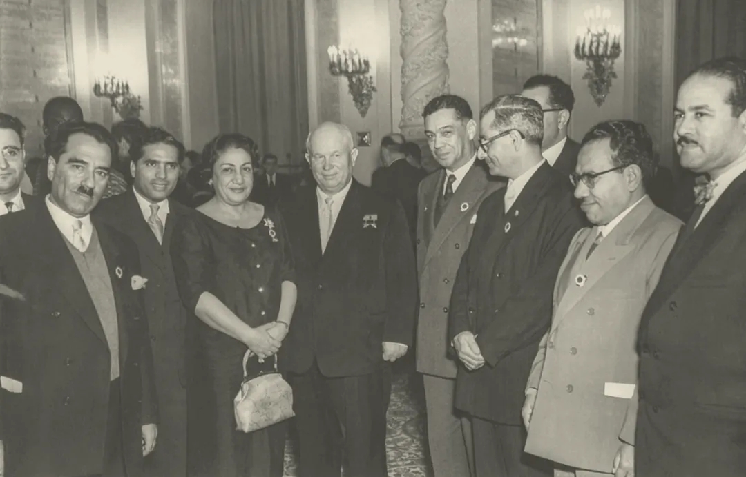 图5 赫鲁晓夫在克林姆林宫接见参加首届亚非作家会议的埃及与叙利亚作家,来源:Rossen Djagalov, From Internationalism to Postcolonialism: Literature and Cinema between the Second and the Third Worlds, p.66.