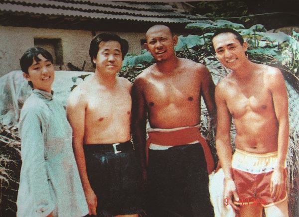 1987年,电影《红高粱》拍摄时莫言与巩俐、姜文和张艺谋合影