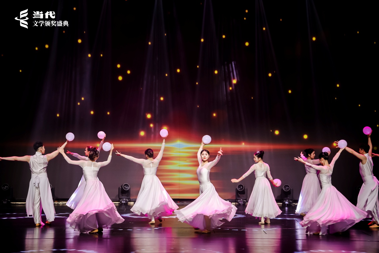 专门根据五佳作品内容编排的舞蹈,分别引导获奖作家走到舞台中心、聚光灯下