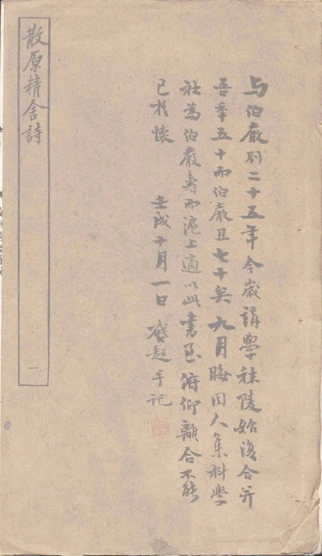 [51] 莫棠《散原精舍诗续集识语》:“壬戌九月二十一日在秣陵,适散原七十初度,相与称祝,越五日,散原过逆旅,赠此本。”梁启超《散原精舍诗手记》:“九月晦,同人集科学社为伯严寿,而沪上适以此书至。”(《陈三立年谱长编》,第1268页)