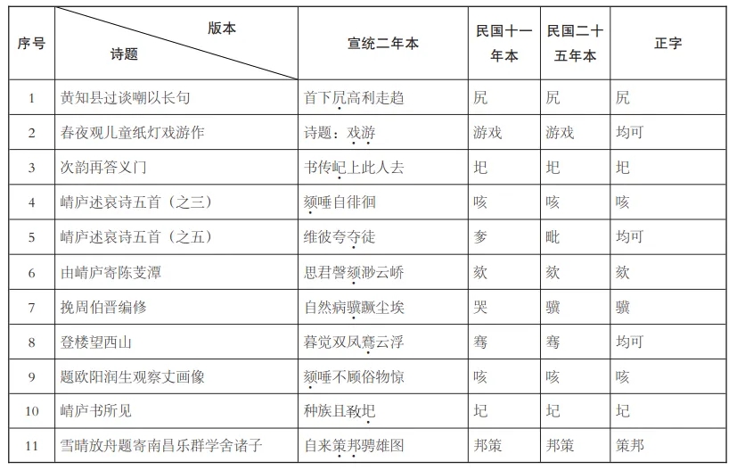 在《续集》部分,也即宣统元年至民国十年共13年所作的877题诗歌中,民国十一年本与民国二十五年本相较,共有31处异文,前者正确仅5处,正确率只有16%,后者正确29处,正确率高达94%。