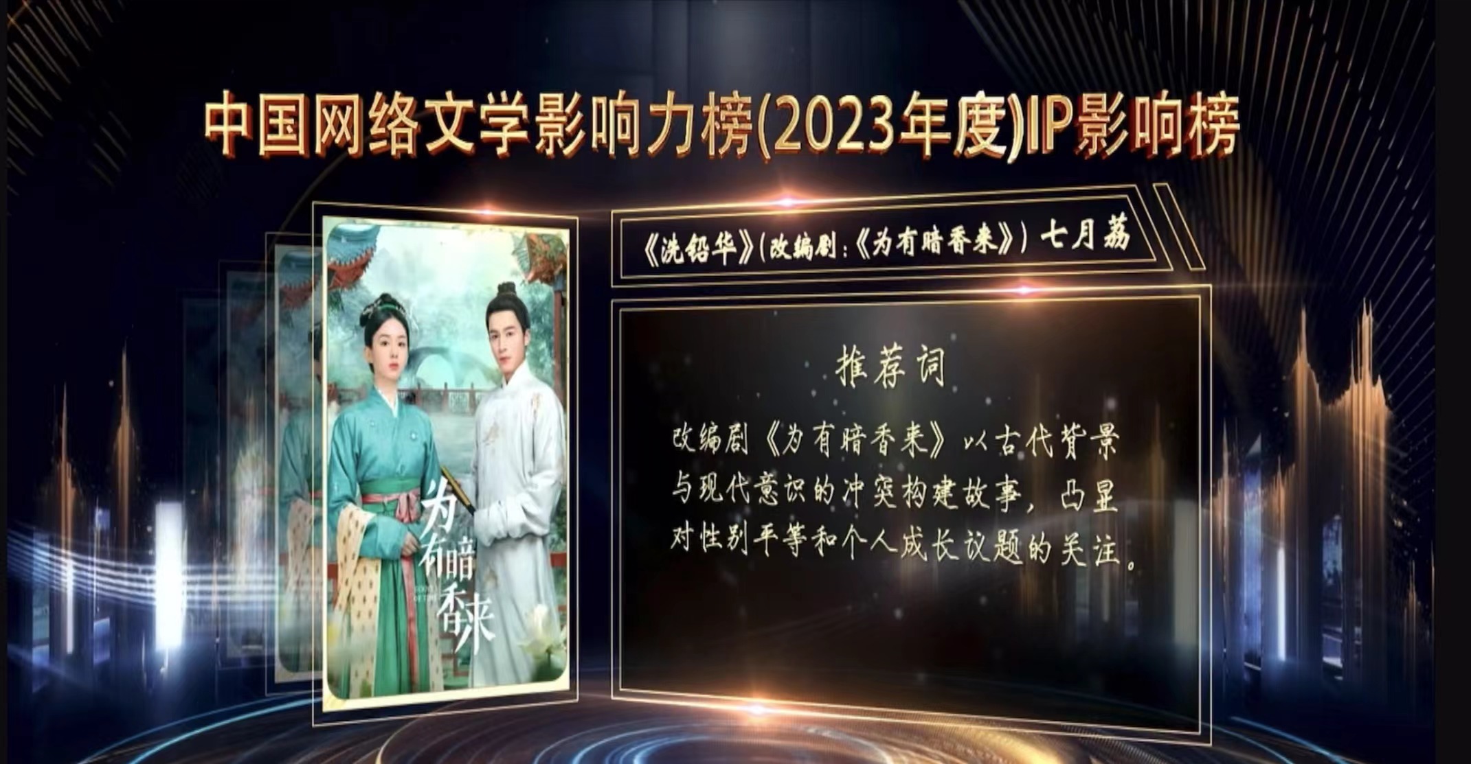 IP影响榜上榜推荐词认为,《洗铅华》改编剧《为有暗香来》以古代背景与现代意识的冲突构建故事,凸显对性别平等和个人成长议题的关注。七月荔表示,故事创作让自己不仅获得物质收入,也收获了无数精神财富,她感到鼓舞和激励,将继续为读者创作好作品。