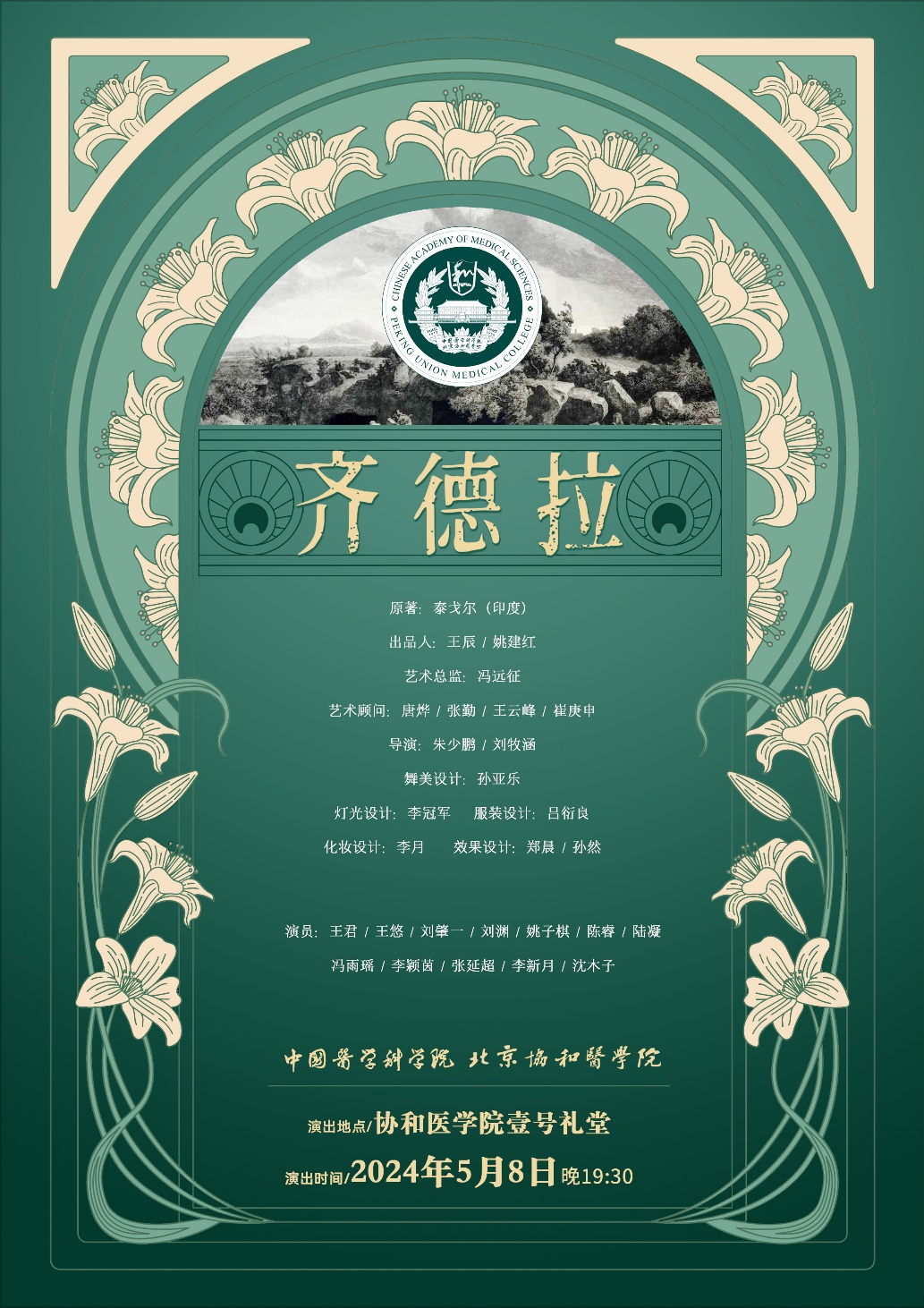 5月8日,由北京协和医学院、北京人民艺术剧院共同创排的泰戈尔抒情诗剧《齐德拉》在北京协和医学院壹号礼堂上演。《齐德拉》是泰戈尔于1891年借用史诗《摩诃婆罗多》素材改编的诗剧,讲述了曼尼普尔国公主齐德拉在春神与爱神的赐佑下获得为期一年的绝世美貌,赢得了英雄阿顺那的爱。此后她却陷入虚假身份与真实自我的矛盾抉择,灵魂备受拷问。剧终,她揭开面纱,向爱人显露本貌并坦陈真相,阿顺那深情接受了真实的她。1924年,泰戈尔访华期间,为庆祝其64岁生日,由徐志摩、林徽因等新月社成员在协和礼堂主演了此剧,这也是《齐德拉》英文版首次在中国演出。100年后的今天,由北京人民艺术剧院院长冯远征担任艺术总监,朱少鹏、刘牧涵导演,北京协和医学院学生再次演出这部经典剧目,具有重要意义。