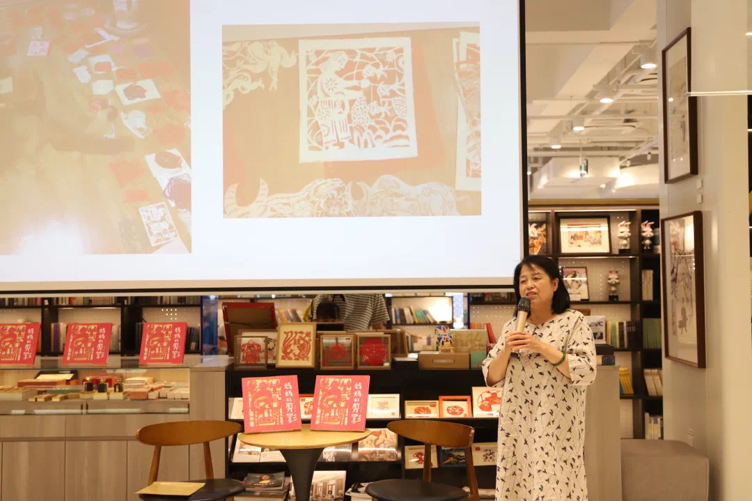 《妈妈的剪影》由画家、剪纸艺术家刘雪纯和图画书作家弯弯共同创作,是她们母女二人跨越30年完成的一部剪纸图画书。作品用我国非物质文化遗产——剪纸的表现手法,刻画了一位喜欢弹琴、刺绣、量体裁衣的姑娘成长为一位快乐的妈妈,和爸爸共同建设美丽乡村、创造美好生活的故事。弯弯现场逐页讲读图画书,她带领小读者从一个女孩的成长、一个小家的变化,去感受生活的变迁、社会的发展,以及人们对美满幸福生活的追求。
